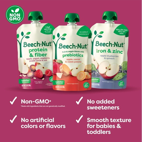 - Beech-Nut's Variety Pack includes (3) Protein & Fiber pouches, (3) Iron & Zinc pouches, and (3) Prebiotic Fiber pouches
