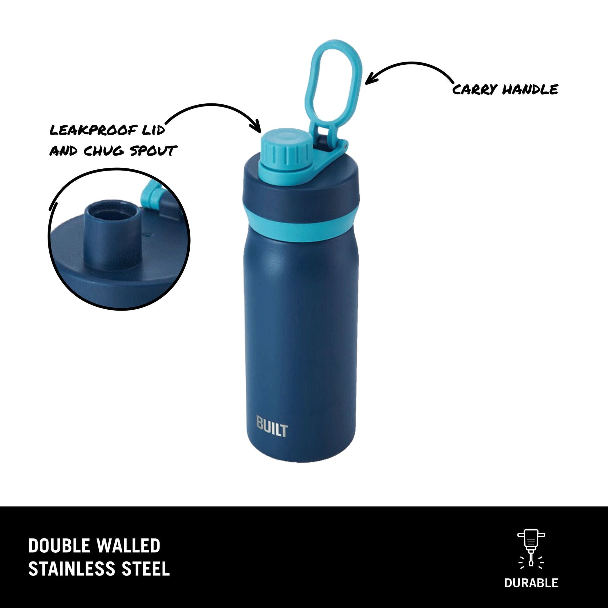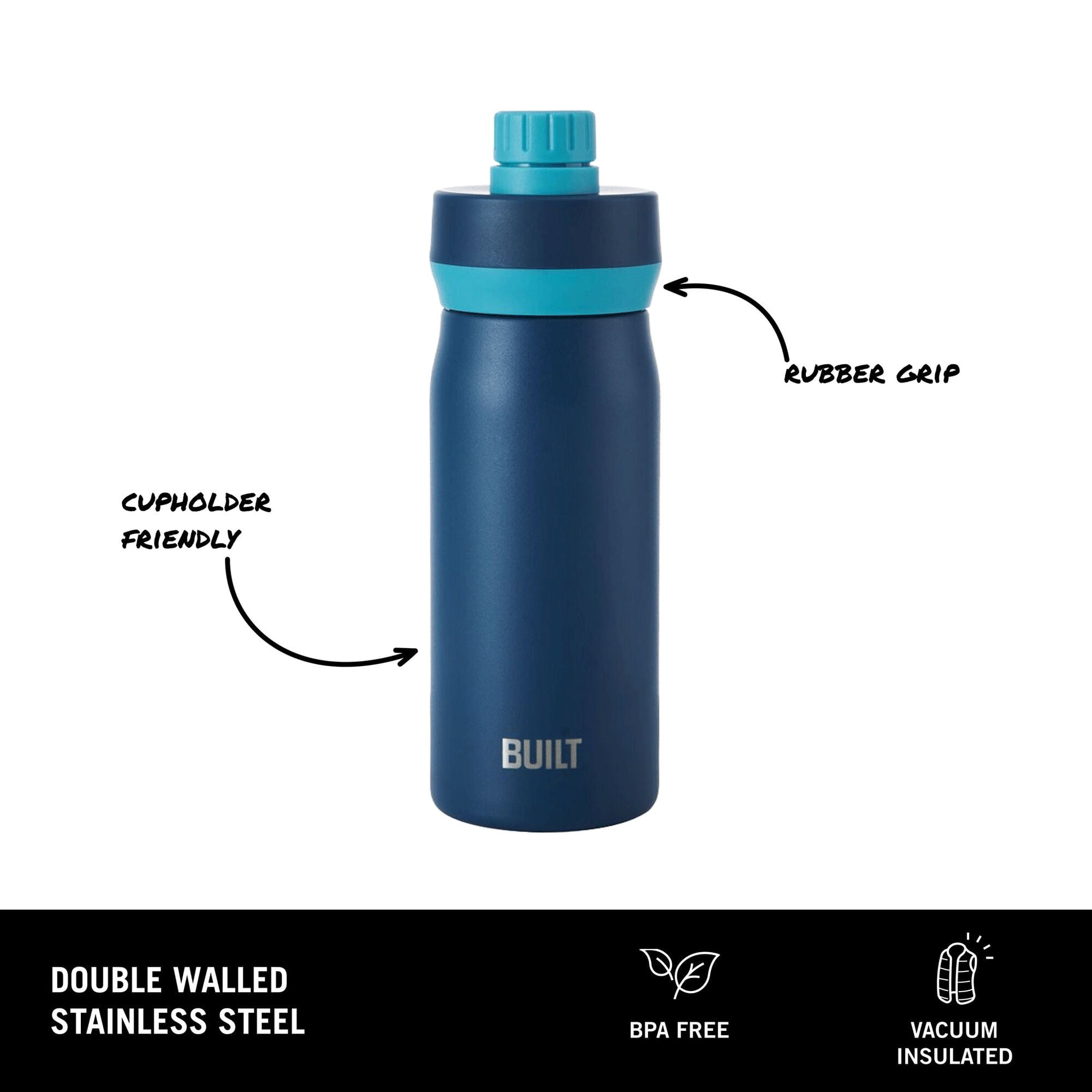 BUILT Cascade 16 oz Stainless Steel Kids Water Bottle with Leakproof Flip-Top Chug Lid, Dark Blue