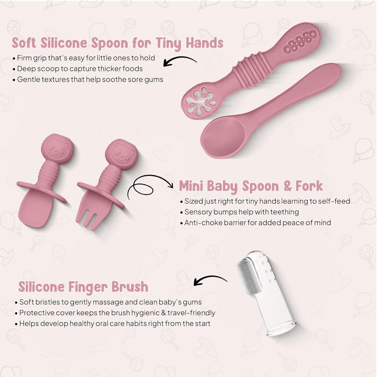 Design with Care - Spoons & Fork: Our wooden spoons and forks are crafted to be soft and gentle for your baby. The back of small silicone cutlery features sensory bumps, providing a playful texture that aids in sensory development. Thoughtfully sized for little hands, these utensils ensure easy grasping and comfortable holding, turning every meal into a delightful experience for your child. They are safe and eco-friendly.