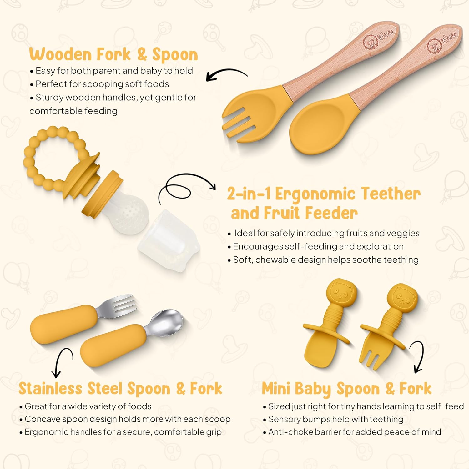 Design with Care - Spoons & Fork: Our wooden spoons and forks are crafted to be soft and gentle for your baby. The back of small silicone cutlery features sensory bumps, providing a playful texture that aids in sensory development. Thoughtfully sized for little hands, these utensils ensure easy grasping and comfortable holding, turning every meal into a delightful experience for your child. They are safe and eco-friendly.