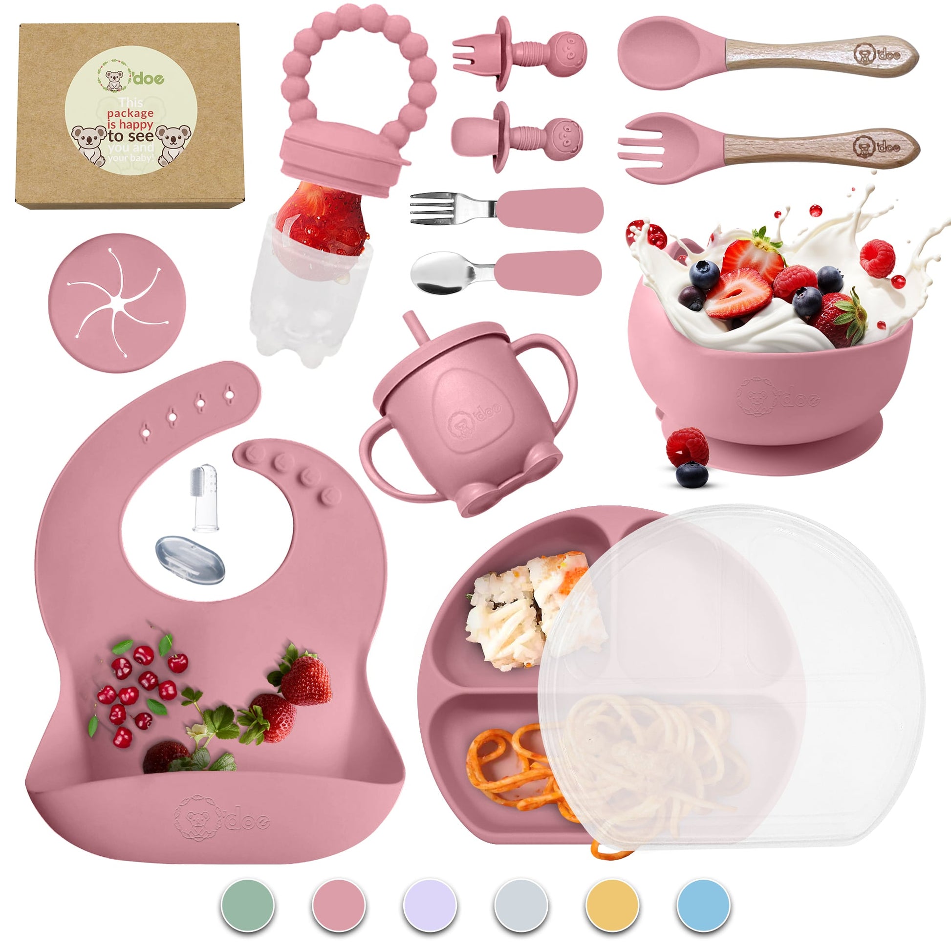 Luxury 17-piece set includes suction bowl, plate, cup, bamboo spoon/fork, and snack cup — made from food-grade silicone.
