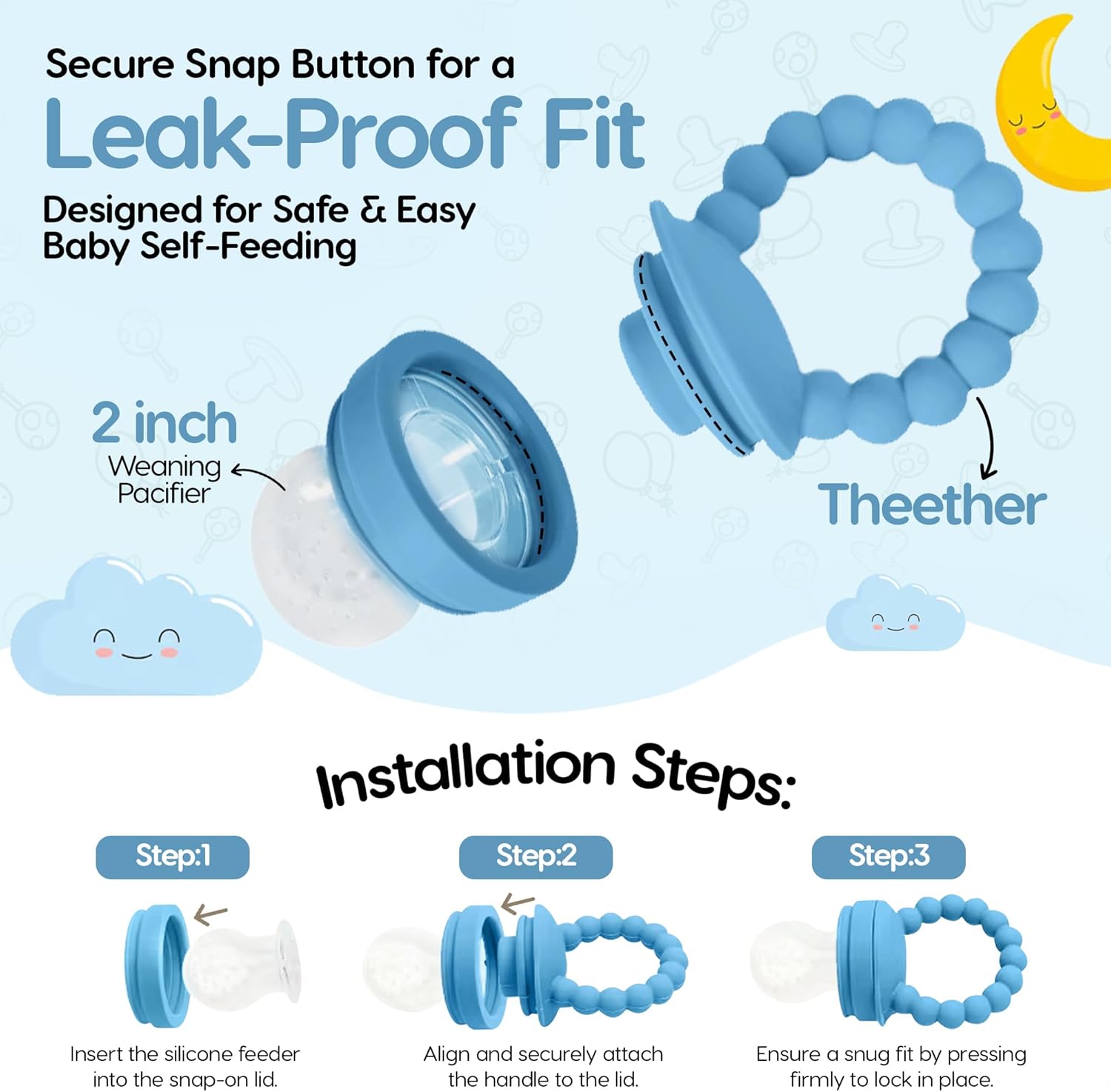 Crafted from BPA-free, food-grade materials, these feeders are ideal for your baby’s safety. Use as a silicone feeder baby, fruit pacifier feeder, or baby food pacifier feeder for fresh fruits and purees.