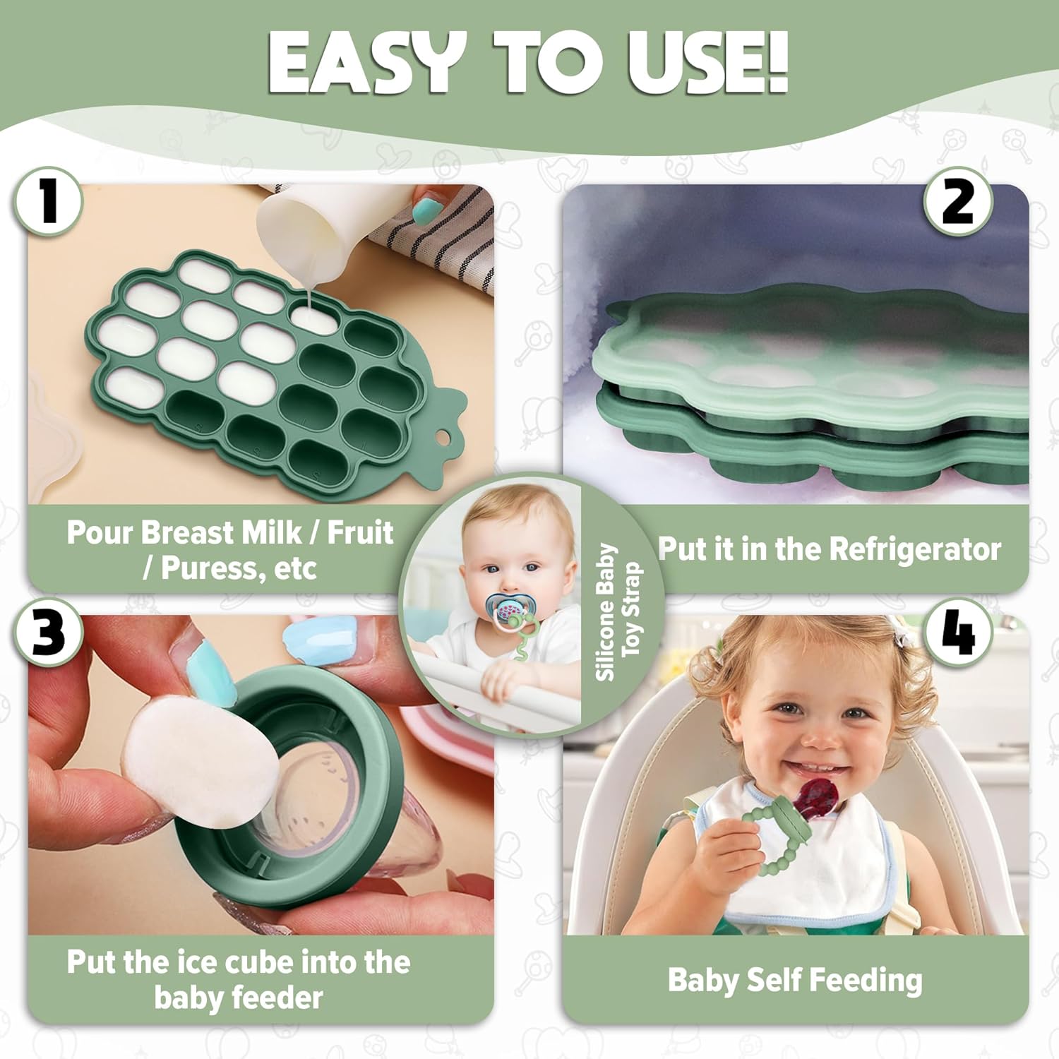 This set includes 1 baby feeder, 3 nipples, 1 clip, and 1 silicone baby food freezer tray with 18 holes. Perfect for creating breastmilk popsicle molds for teething, storing baby food, and keeping feeding simple and fun.
