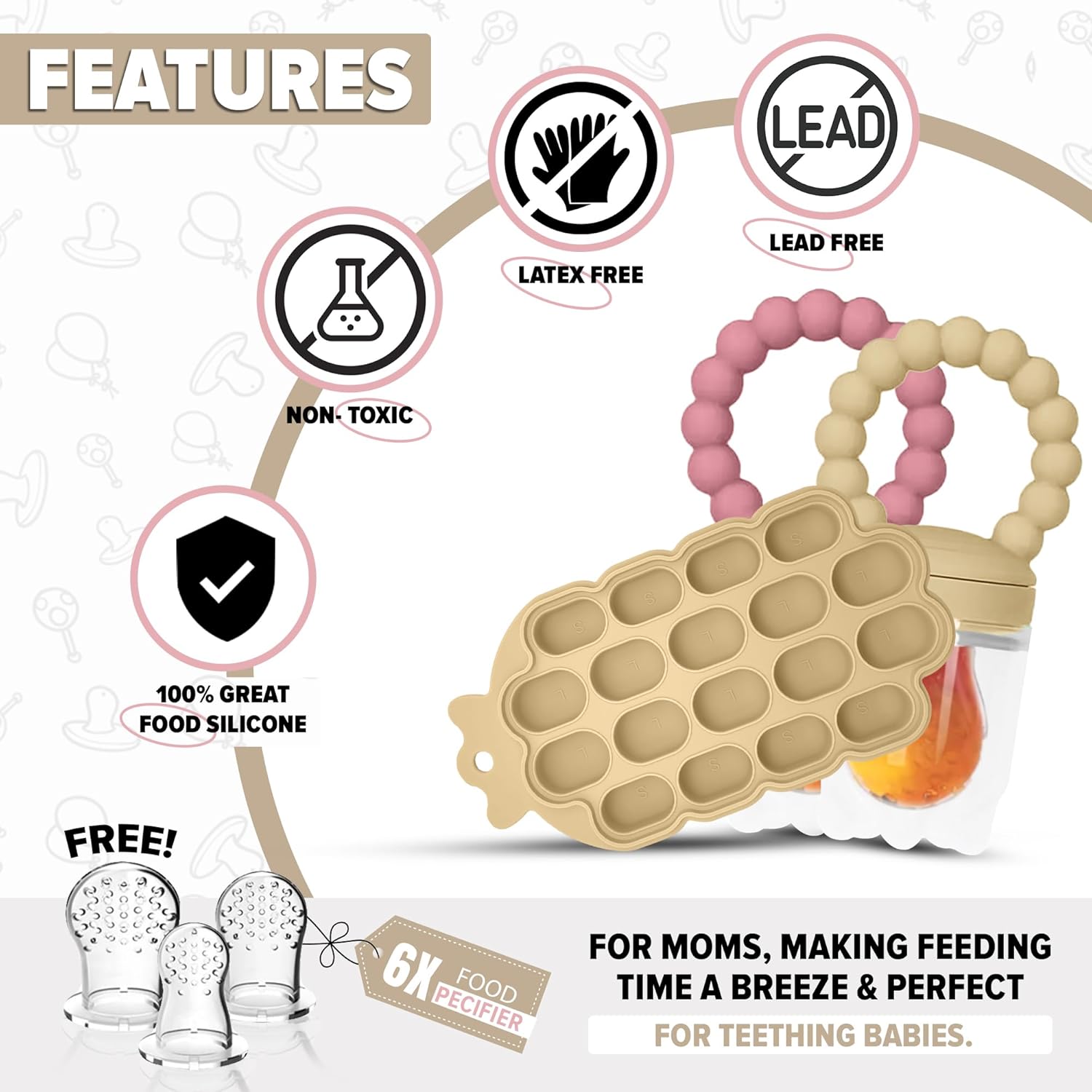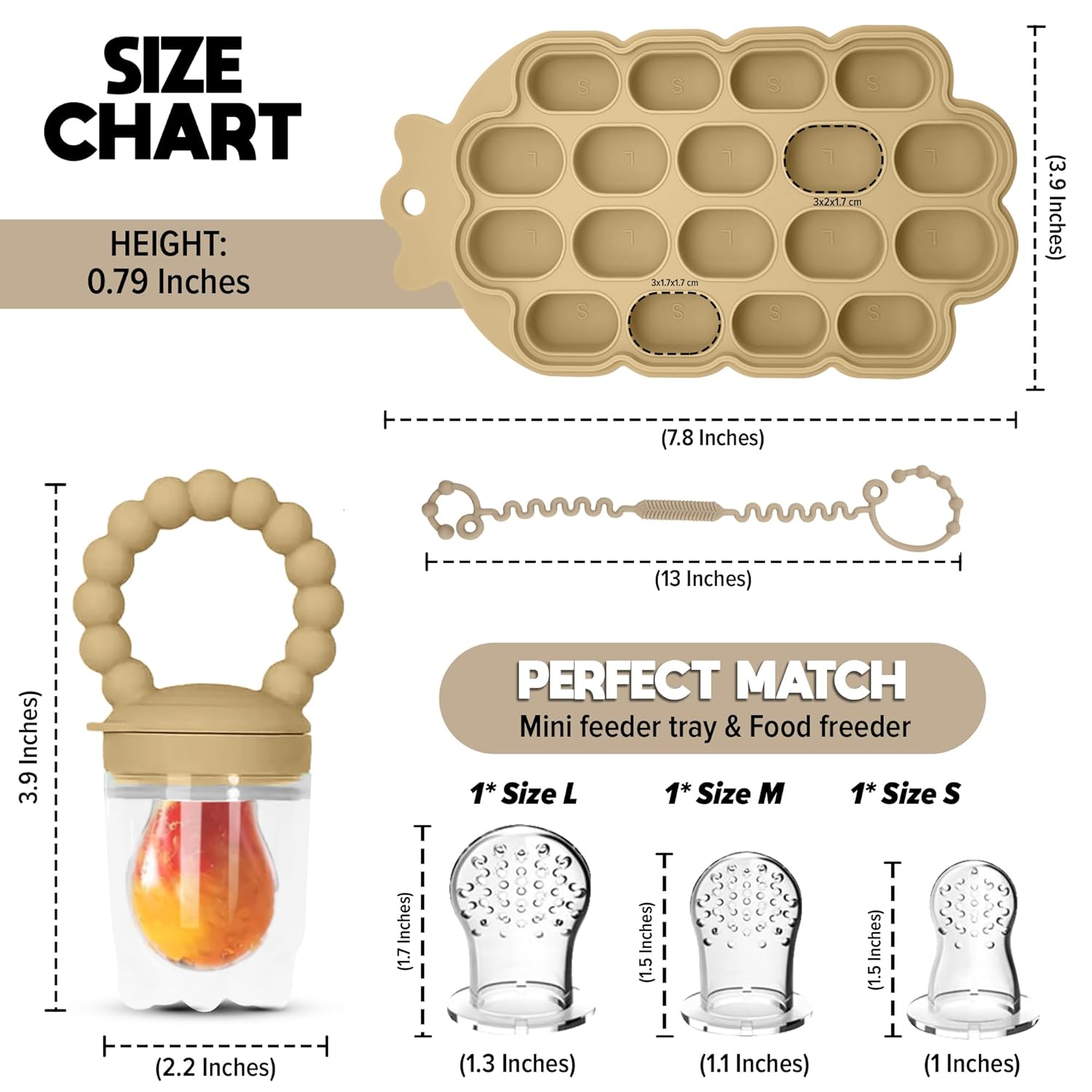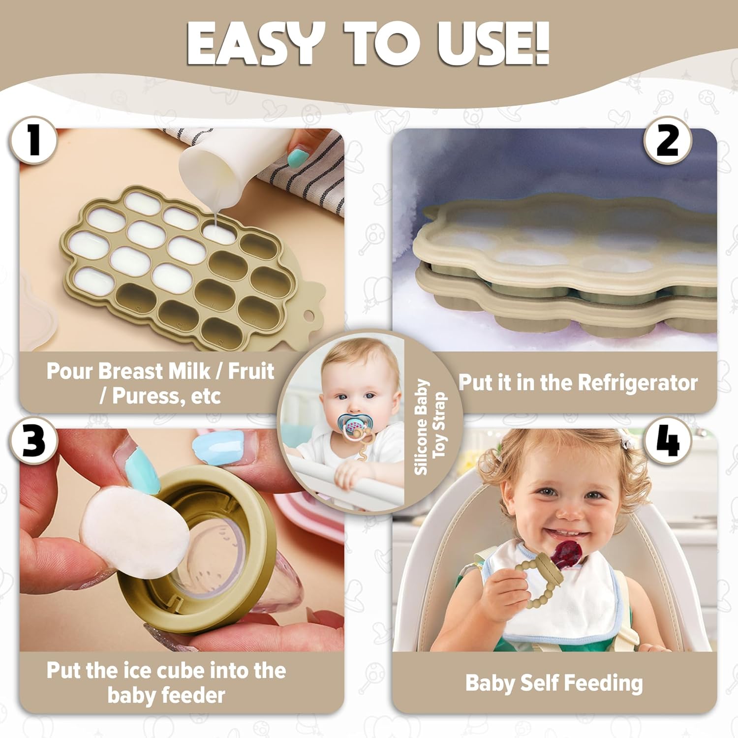 This set includes 1 baby feeder, 3 nipples, 1 clip, and 1 silicone baby food freezer tray with 18 holes. Perfect for creating breastmilk popsicle molds for teething, storing baby food, and keeping feeding simple and fun.