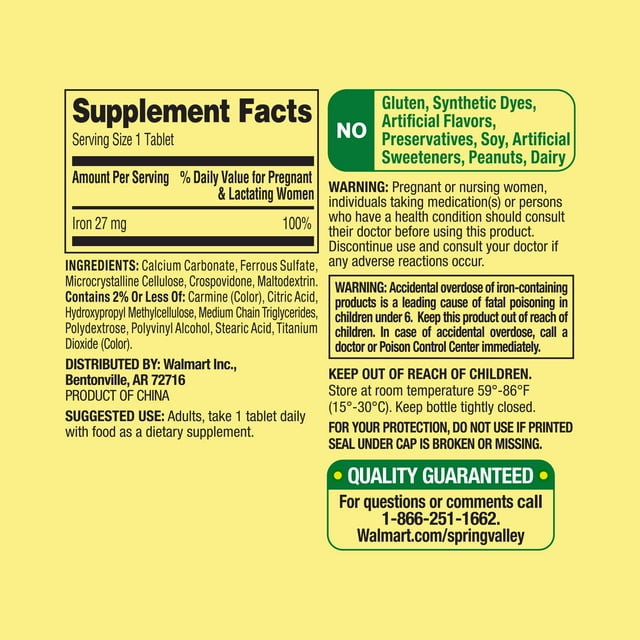 - Spring Valley Iron Prenatal Health Dietary Supplement Tablets, 27 mg, 250 Count