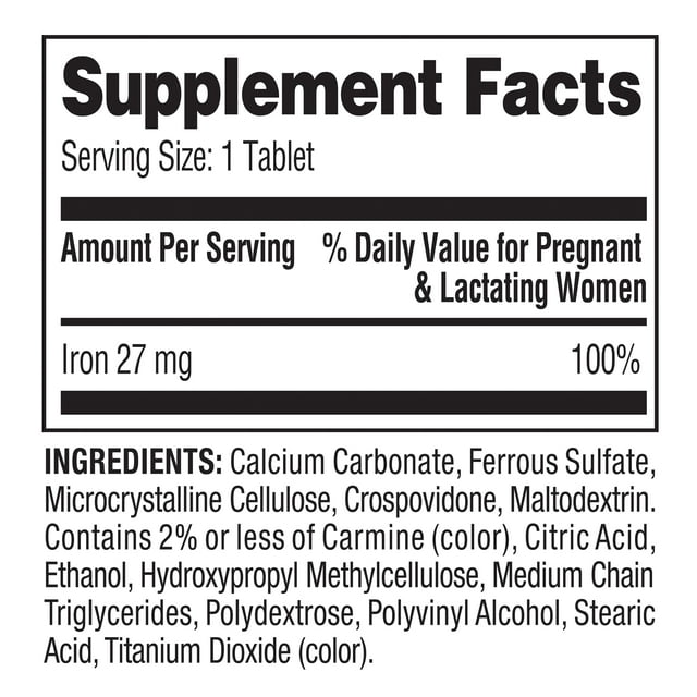 - 27 mg of iron (as ferrous sulfate) per tablet
