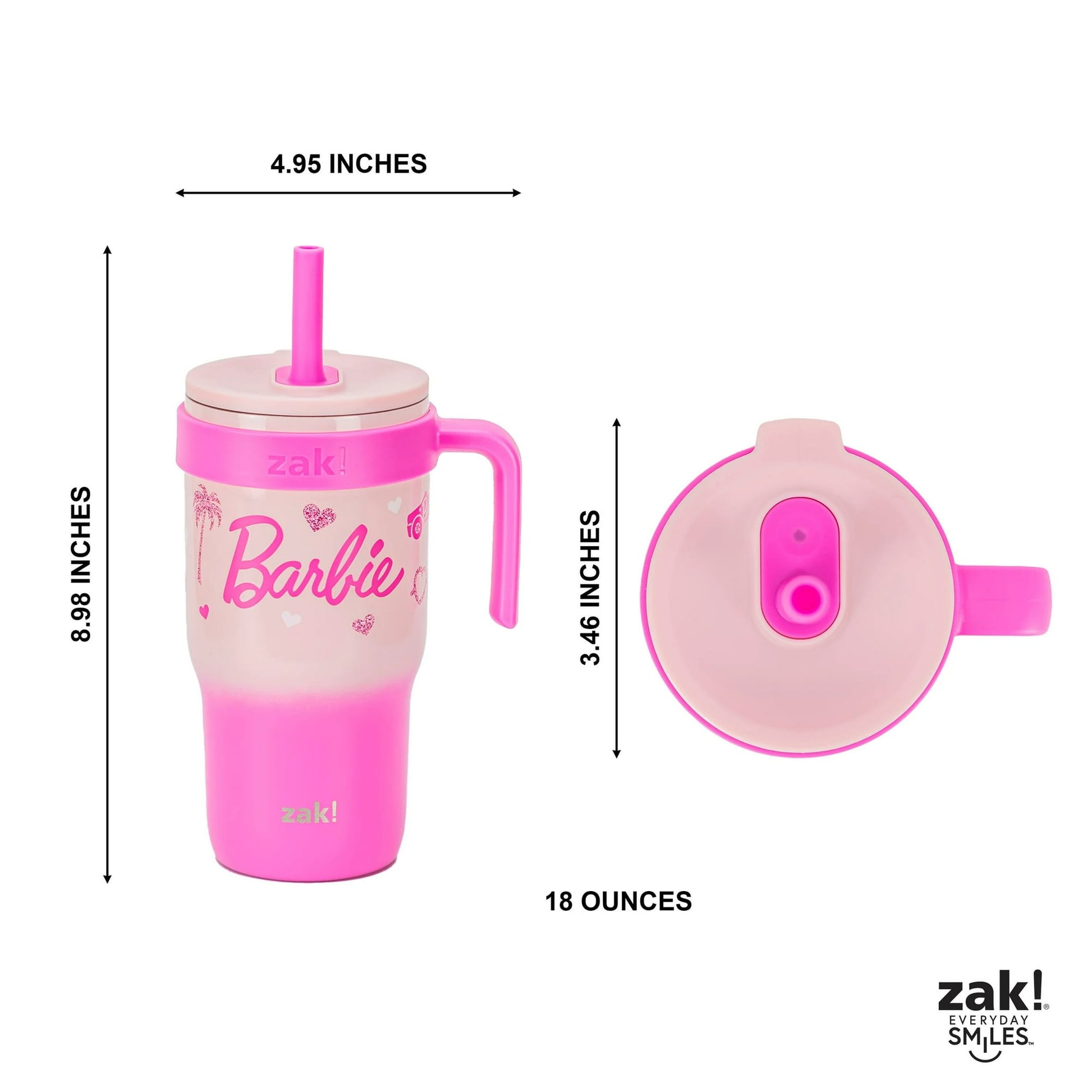 Zak Designs 18oz Barbie Kids Straw Handle Tumbler, Stainless Steel Vacuum Insulated Cruiser Tumbler with Silicone Straw Utilizing Leak-Proof Valve, Travel Straw Tumbler with Handle